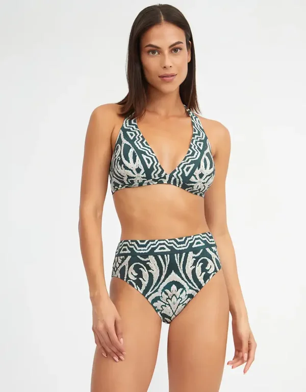Il top bikini Valeria Plunge di Nuria Ferrer, con stampa damascata verde e bianca, è un modello con scollo a V profondo e coppe preformate per dare forma e un sostegno confortevole.