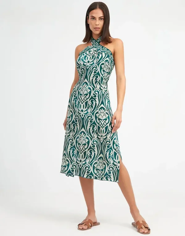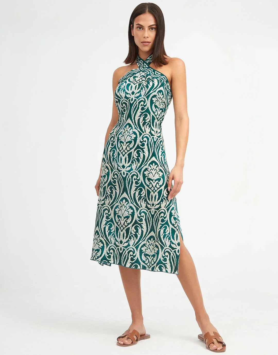 L'abito da spiaggia Valeria Maxi di Nuria Ferrer è un sofisticato modello midi in una sorprendente stampa damascata verde e bianca. Caratterizzato da un'alta scollatura a V incrociata e da un laccetto fluido sul retro, questo abito mette elegantemente in mostra le spalle. Uno spacco laterale alto fino alla coscia aggiunge un tocco di movimento alla sua silhouette ariosa.
