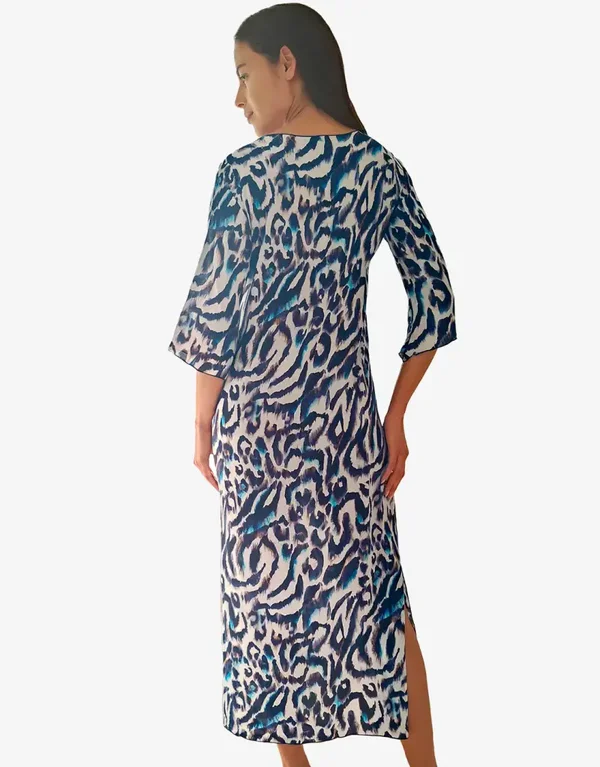L'abito Alika Beach di Nuria Ferrer, con una sorprendente stampa animalier, è un abito midi con una profonda scollatura, un anello al centro e un dettaglio tagliato sotto, con maniche che arrivano al gomito.