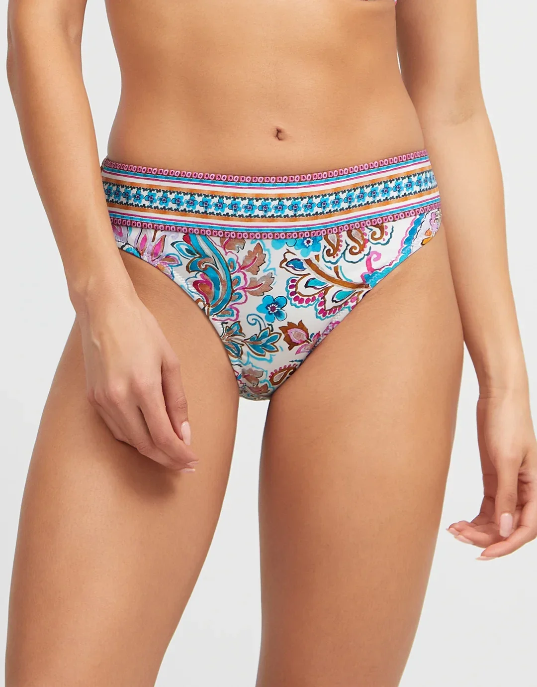 Lo slip bikini Laia di Nuria Ferrer, con una splendida stampa paisley decorata con turchesi, rossi e rosa su sfondo bianco, è un modello a vita bassa che offre una copertura totale. Un delicato bordo stampato intorno alla vita aggiunge un elegante tocco finale.