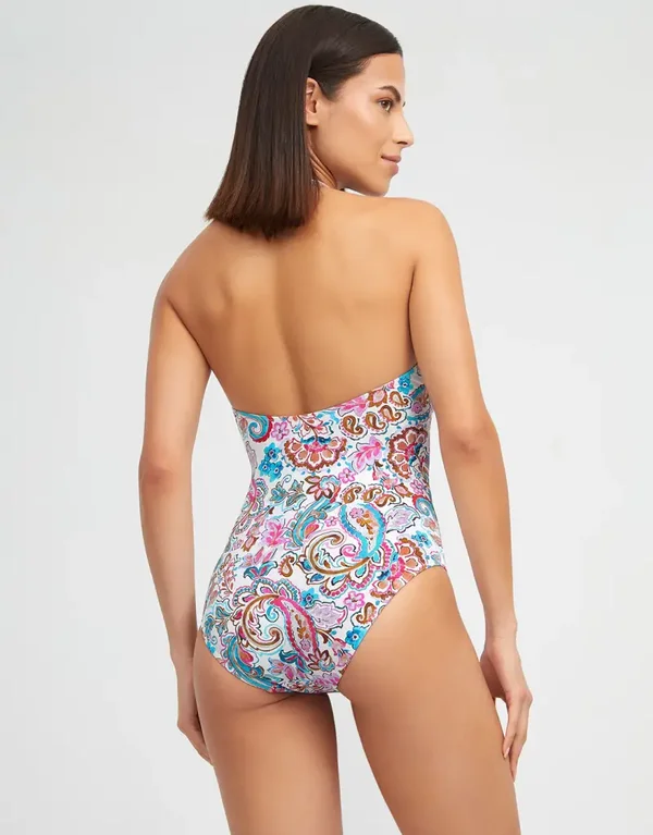 Il costume intero Laia Plunge di Nuria Ferrer, in una vivace stampa paisley multicolore di blu turchese, rosa e rosso su sfondo bianco, è uno splendido modello con scollo all'americana. Presenta una profonda scollatura con apertura a goccia sotto il seno, elegantemente impreziosita da una linguetta decorativa. Il bordo turchese in vita, abbinato al controllo della pancia, esalta la silhouette, mentre le coppe preformate offrono un sostegno confortevole.