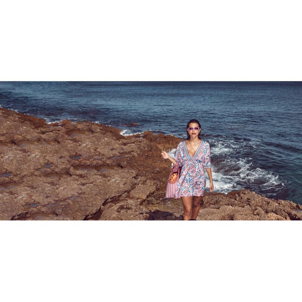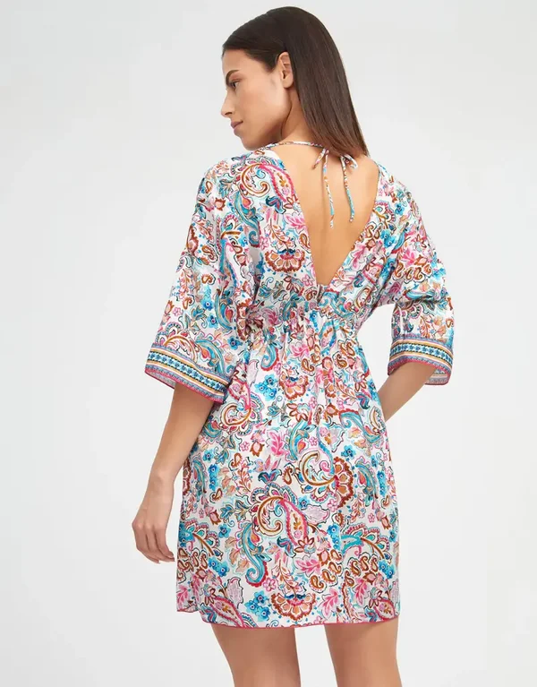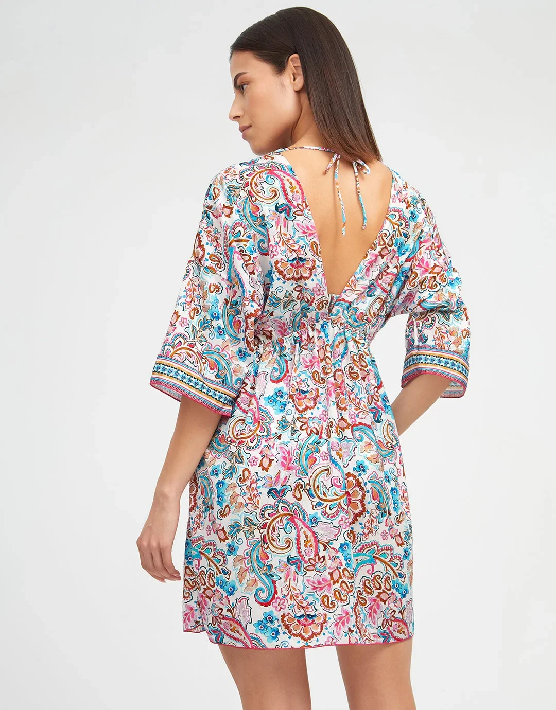 L'abito da spiaggia Laia Gathered di Nuria Ferrer è un bellissimo miniabito in una vivace stampa paisley di turchese, rosa e rosso su sfondo bianco. Caratterizzato da una lusinghiera scollatura a V incorniciata da un bordo turchese, laccetto al collo ed eleganti maniche a tre quarti svasate, questo modello fresco è perfetto per uno stile disinvolto in spiaggia.