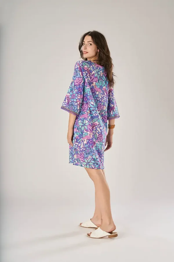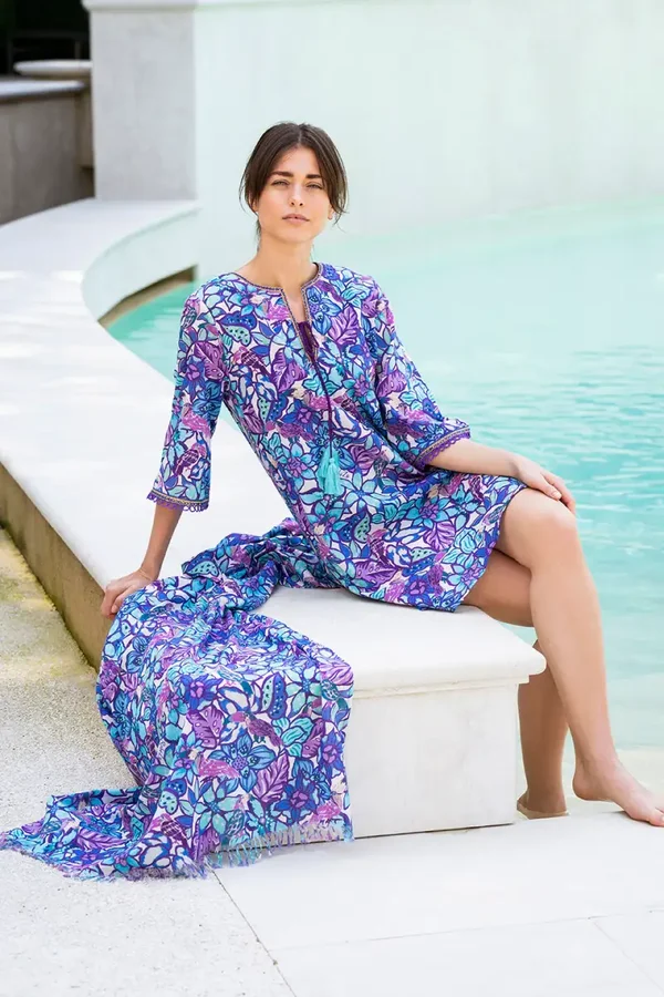 Caftano in cotone stampato a mano con passamaneria sullo scollo e fiocchi fatti a mano. Comode tasche, spacchi laterali.