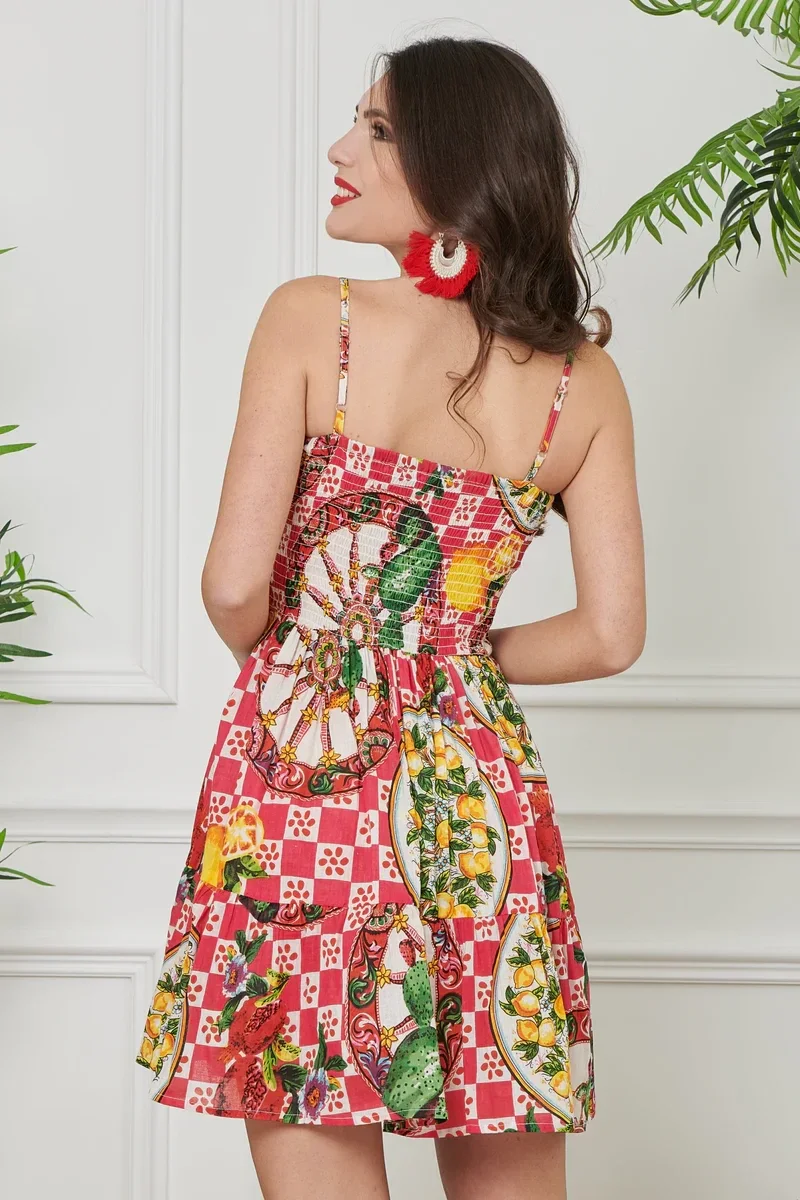 Abito realizzato con tessuto in puro cotone per garantire massimo comfort durante l'uso. Il corpetto elastico si adatta perfettamente al corpo, mentre la fantasia e il fondo balzato lo rendono unico e originale. La stampa non piazzata garantisce un look unico per ogni articolo